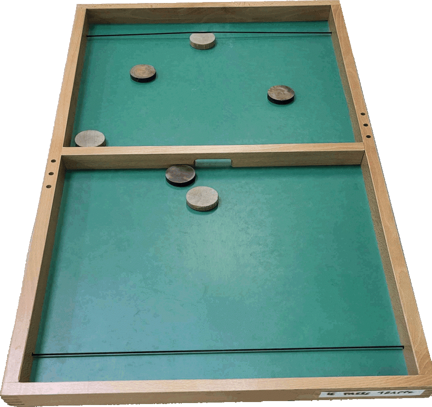 L’objectif est de propulser le plus vite possible à l’aide des élastiques le maximum de palets à travers la trappe dans le camp adverse.